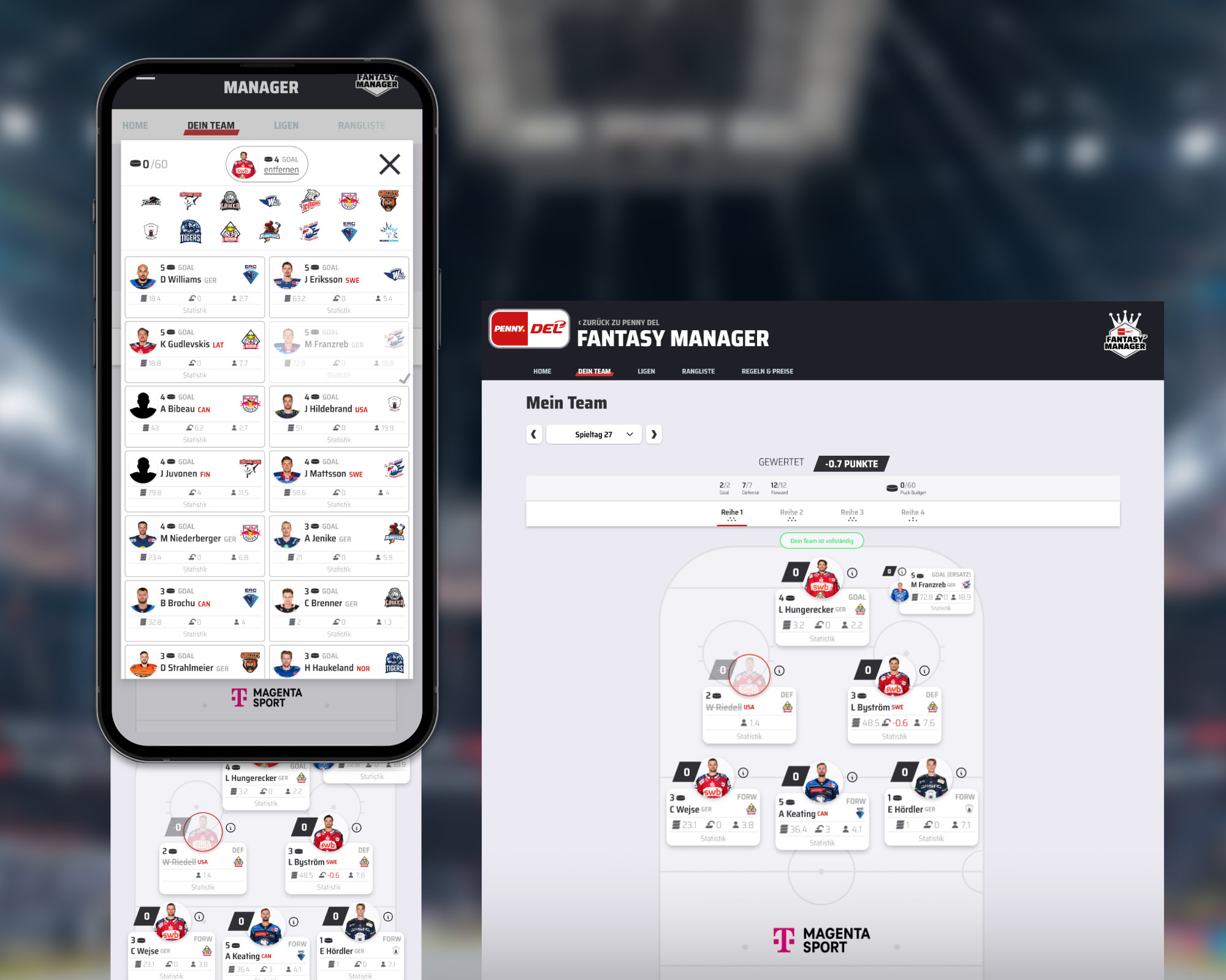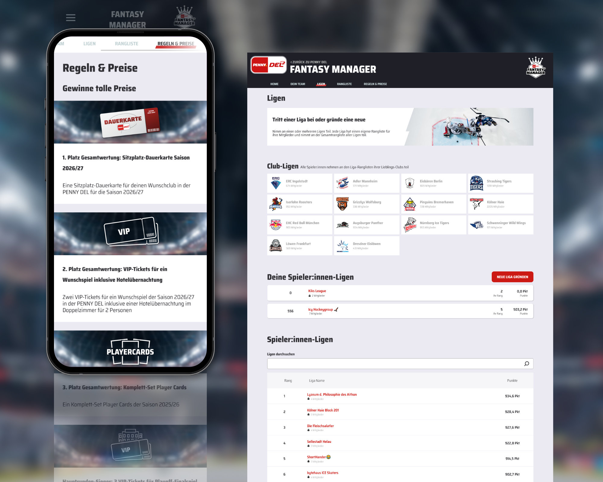 Der PENNY DEL Fantasy Manager begleitet die Eishockey Saison 2025/26. Beweise dich als Manager und stelle dein eigenes Team auf, um in der Rangliste aufzusteigen. Dafür haben alle Nutzer das gleiche Puck Budget zur Verfügung, also zählt an dieser Stelle dein Fachwissen. Spieler werden nach den Spieltagen bewertet und du erhältst Punkte entsprechend ihrer Leistung. Den besten Spielern winken tolle Preise, wie eine Dauerkarte für deinen Wunschclub für die gesamte Saison 2026/27!