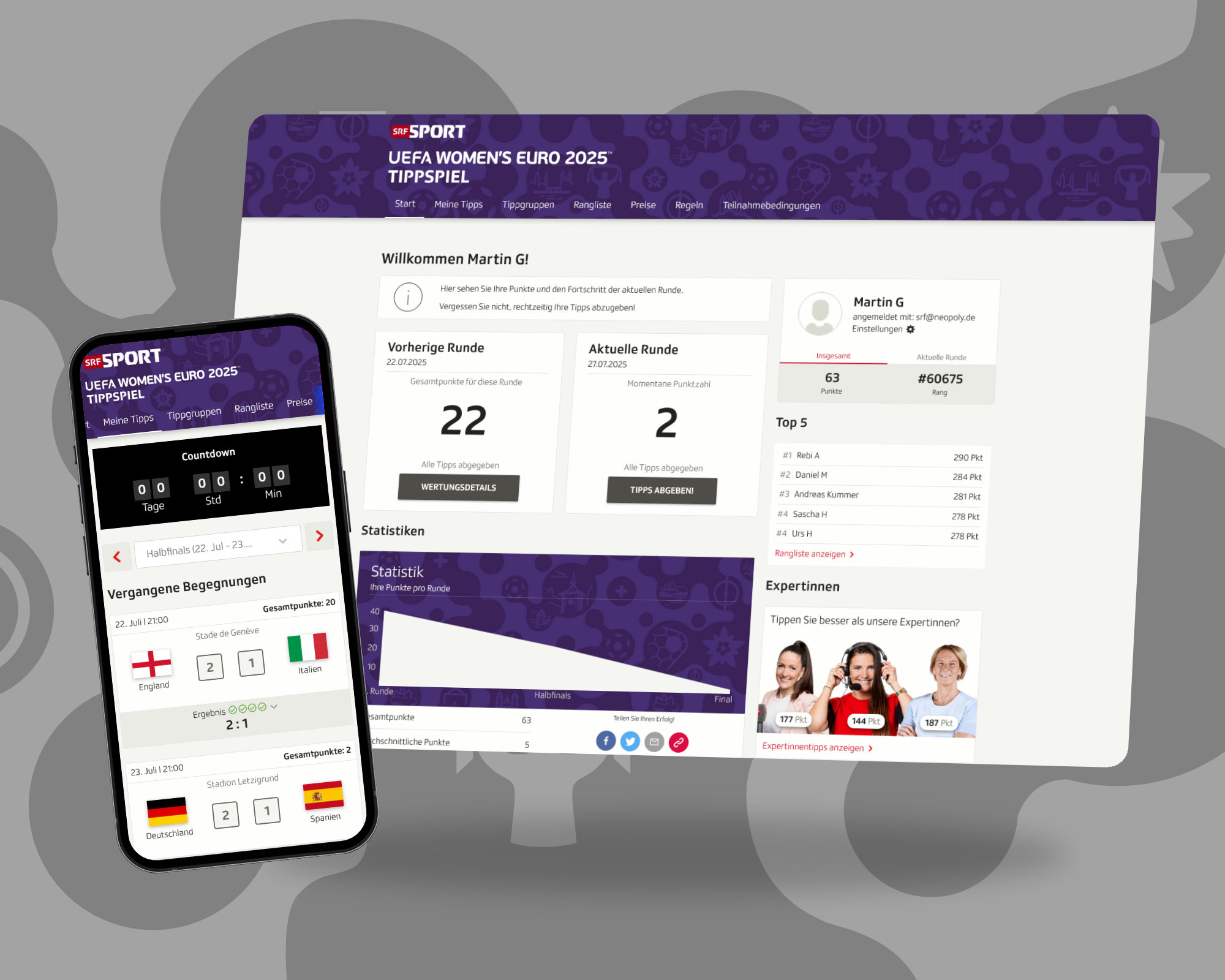 The Women’s Football Championship 2025 was hosted in Switzerland. Naturally the SRF provides the predictor for fans to participate in the big event. Make predictions on all the match-ups and answer some additonal interesting questions: Who will become champion? How far will Switzerland come? How many goals will the top scorer score? Compare your results with other players on the leaderboard or SRF’s own experts to win signed jerseys and tickets to the games!