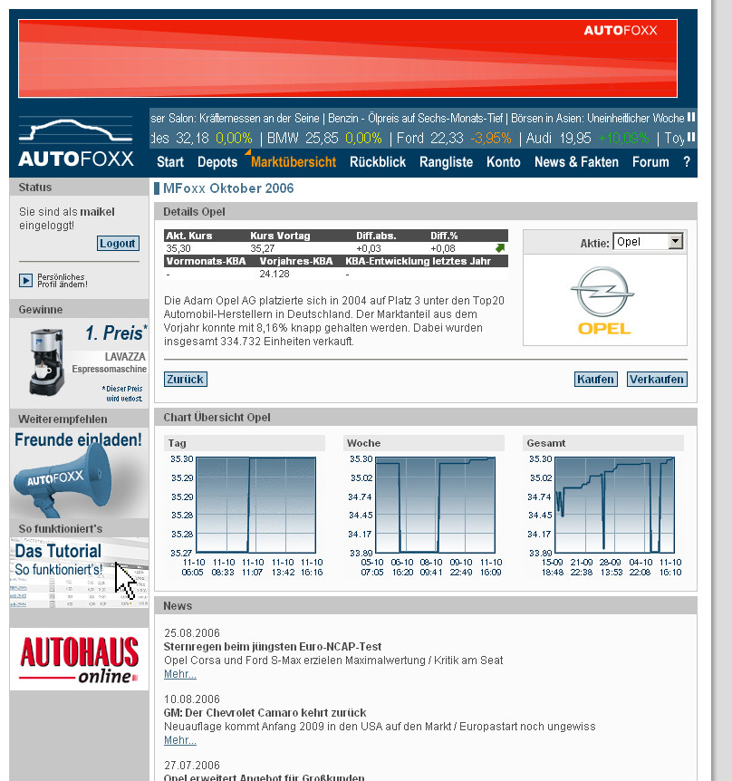 AutoFoxx.de is a virtual market for the forecast of sales numbers in the automobile industry. The users speculate with virtual shares of automobile manufacturers (MFoxx) and model novelties (Foxx) in two different markets.