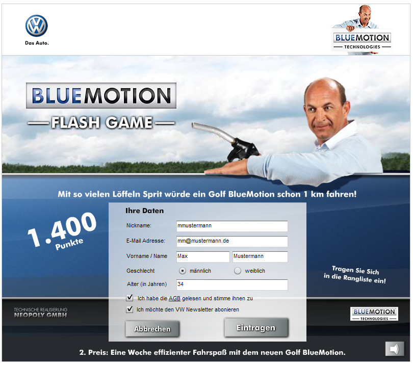 Depending on their skill, the users can collect points and enter their data in a highscore ranking at the end of the game. The best players receive prizes, such as a Golf Blue Motion for a whole month.