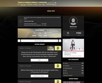 The 2022 winter Paralympic Games held in Beijing are also getting covered by Team Deutschland in their own predictor game. Users are able to show off their knowledge of previous Paralympic Games and make their predictions for upcoming disciplines. Players can compare their results together in communities or on their own against official experts and other players on the leaderboards, while top ranking users are given the chance to win special prizes.