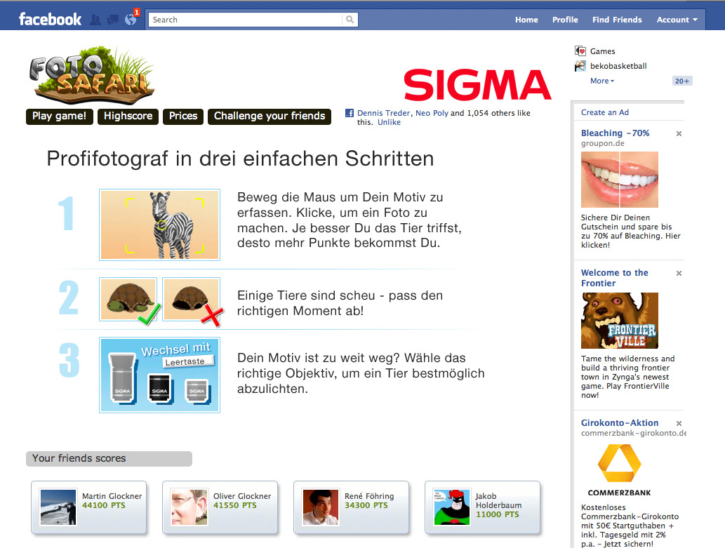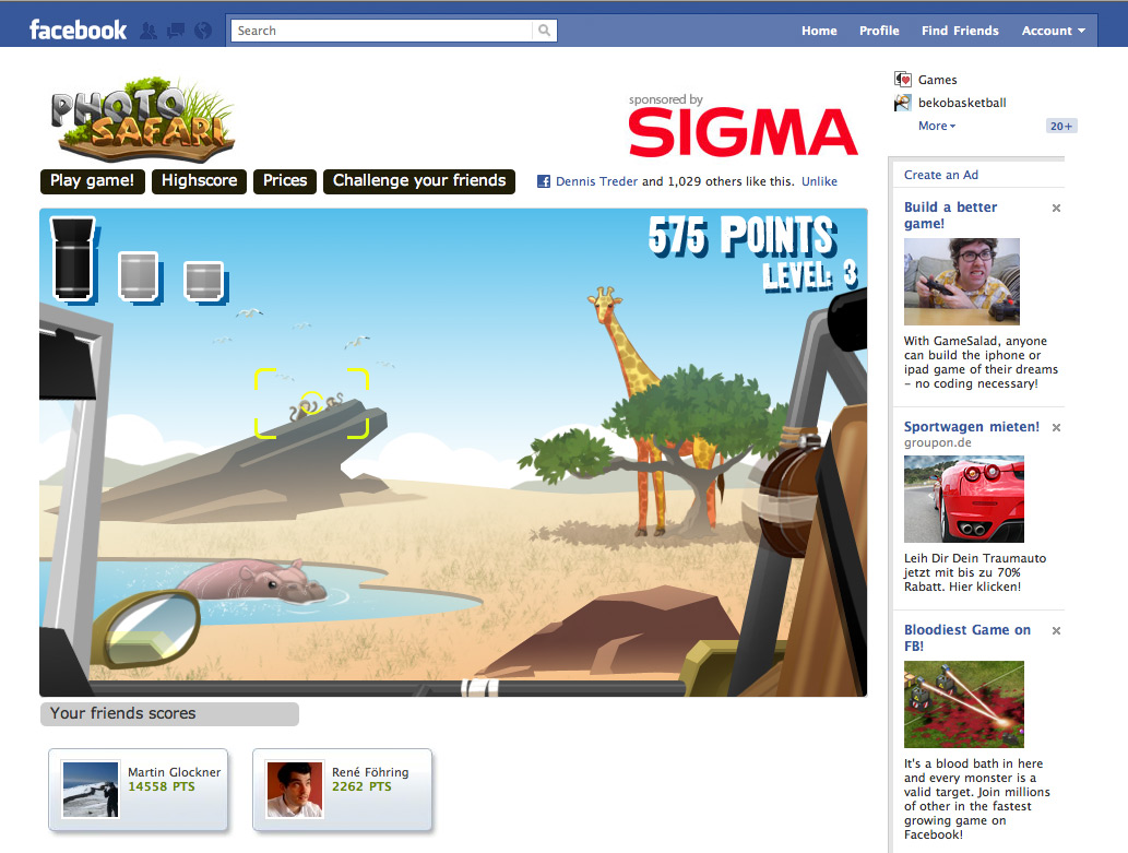Sigma Safari is an interactive facebook game. The user travels through Africa on a photo safari. He observes the environment through the camera objective. He can move the crosshair freely with his mouse and shoot pictures. Switching the zoom let’s you closeup on the animals.