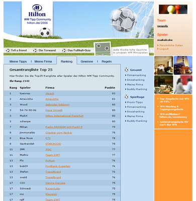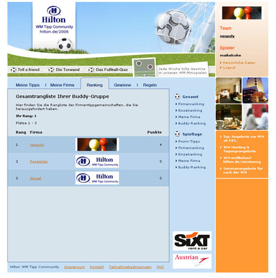 This game was designed for Hilton and dealt with the Football World Cup 2006, too. Players bet on the results of matches. In addition to regular bets, additional bets can be handed in for every day which editorially refer to special features of the matches.
