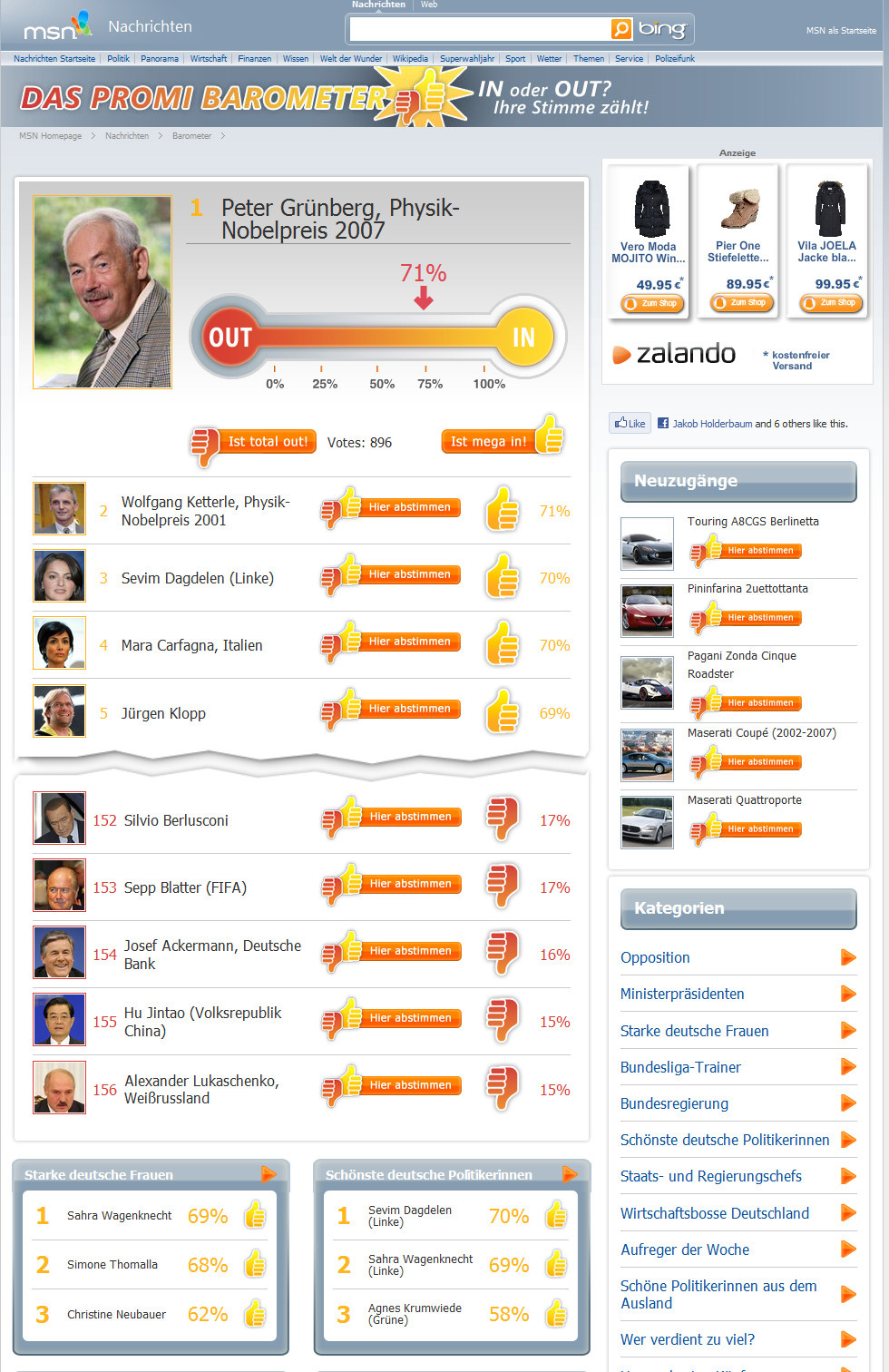 With this application MSN offers the chance to rate VIPs. By clicking on the respective choice the user gives a rating for a specific public person. The results are visible to the public and can be voted by other users.