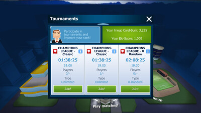 After registration, the user gets 14 initial cards. These cards will be picked by a special algorithm: His team contains 1 goalie, 4 attackers, 5 midfielders and 4 defenders in a basic line-up (3-4-3) with the best possible players from his initial squad.