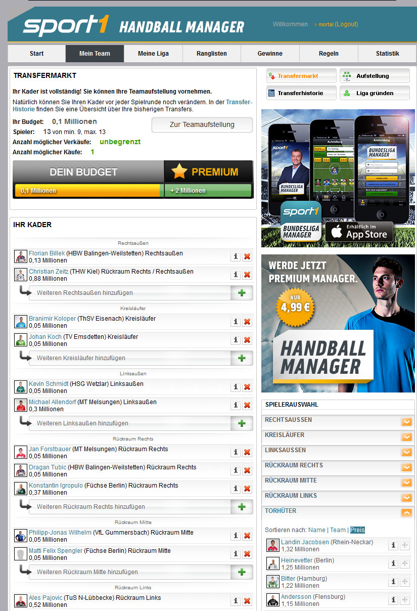 Sport1 Handball Manager 2013/14 Virtual manager game for handball fans