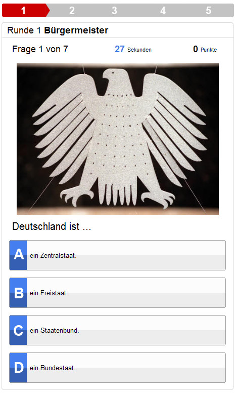 A quiz game on the subject of German politics and demographics on the evening before the German Bundestag elections. Users must give answers to quiz questions in five rounds with different levels of difficulty. It’s possible to get a time bonus for every question.