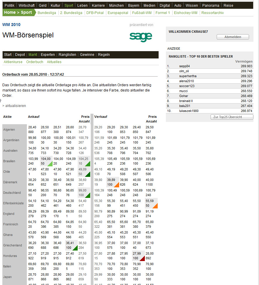 Neopoly developed this stock exchange game for the WC 2010 in South Africa for sueddeutsche.de. Users can trade all participating teams as shares in a virtual portfolio.
