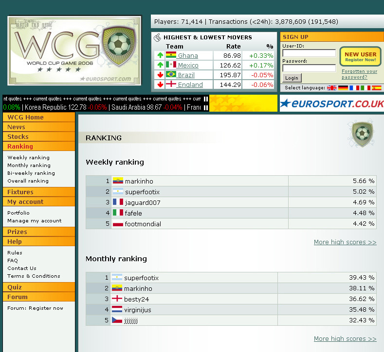 The Eurosport World Cup Game is a stock exchange game covering the World Cup 2006.